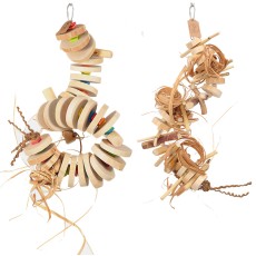 Jucărie cu multe elemente de ciugulit și ronțăit, pentru papagali de orice talie, cu densități de la foarte moale până la esență medie. Materiale: fibră de lemn, elemente din tulpină de porumb, lemn de esență moale, sfoară din fibră de cocos, sârmă inox, lanț inox. Înălțime totală (întinsă): 50 cm...